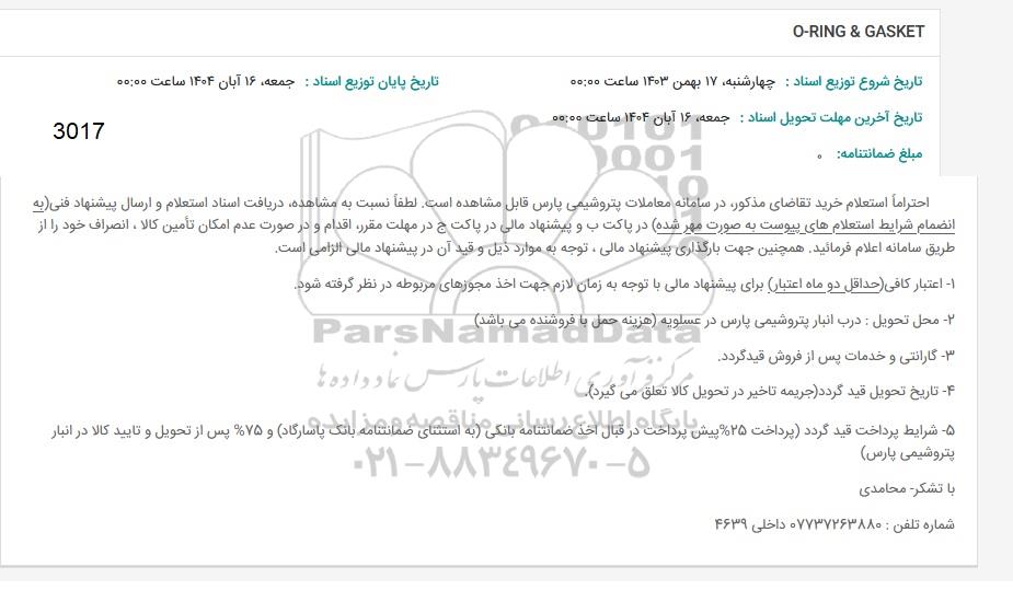 احتراماً استعلام خرید تقاضای مذکور در سامانه معاملات پتروشیمی پارس قابل مشاهده است. لطفاً نسبت به مشاهده دریافت اسناد استعلام و ارسال پیشنهاد فنی به انضمام شرایط استعلامهای پیوست به صورت مهر شده در پاکت ب و پیشنهاد مالی در پاکت ج در مهلت مقرر اقدام و در صورت عدم امکان تأمین کالا ، انصراف خود را از طریق سامانه اعلام فرمائید. همچنین جهت بارگذاری پیشنهاد مالی، توجه به موارد ذیل و قید آن در پیشنهاد مالی الزامی است.