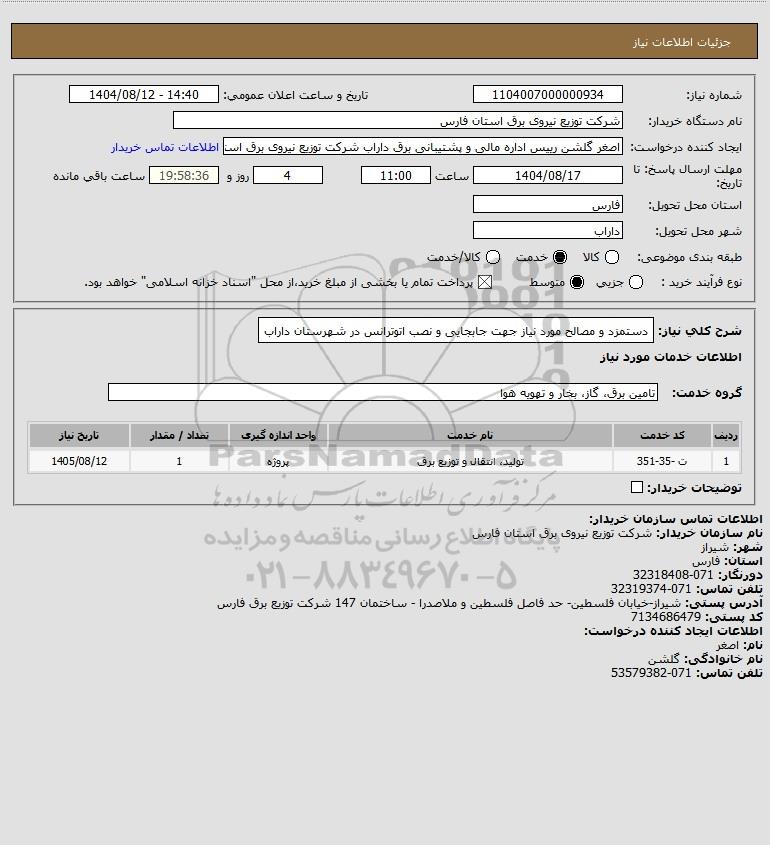 شرح کلی نیاز: دستمزد و مصالح مورد نیاز جهت جابجایی و نصب اتوترانس در شهرستان داراب