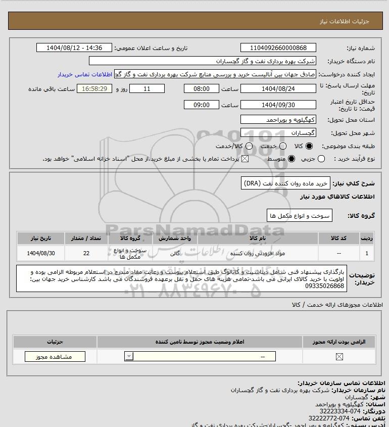 شرح کلی نیاز: خرید ماده روان کننده نفت (DRA)
