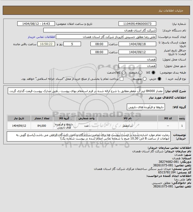 | 1 | -- | آب مقطر | عدد | داروها و فرآورده های دارویی | 84,000 | 1404/09/12 |