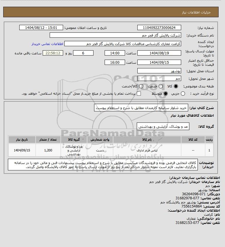 شرح کلی نیاز: خرید شلوار سالیانه کارمندان مطابق با شرح و استعلام پیوست