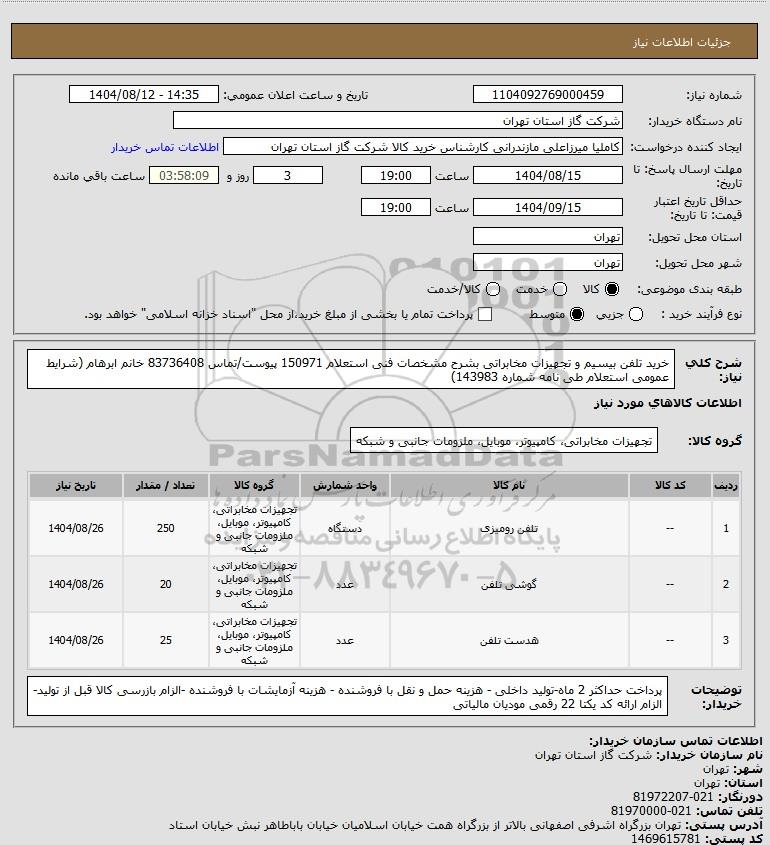 | 2 | -- | گوشی تلفن | عدد | تجهیزات مخابراتی، کامپیوتر، موبایل، ملزومات جانبی و شبکه | 20 | 1404/08/26 |