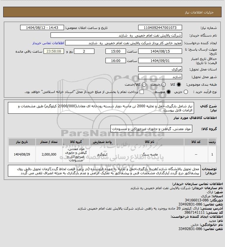 1 -- ماسه سنگ کیلوگرم مواد معدنی، گیاهی و جانوری غیرخوراکی و منسوجات 2,000,000 1404/08/29