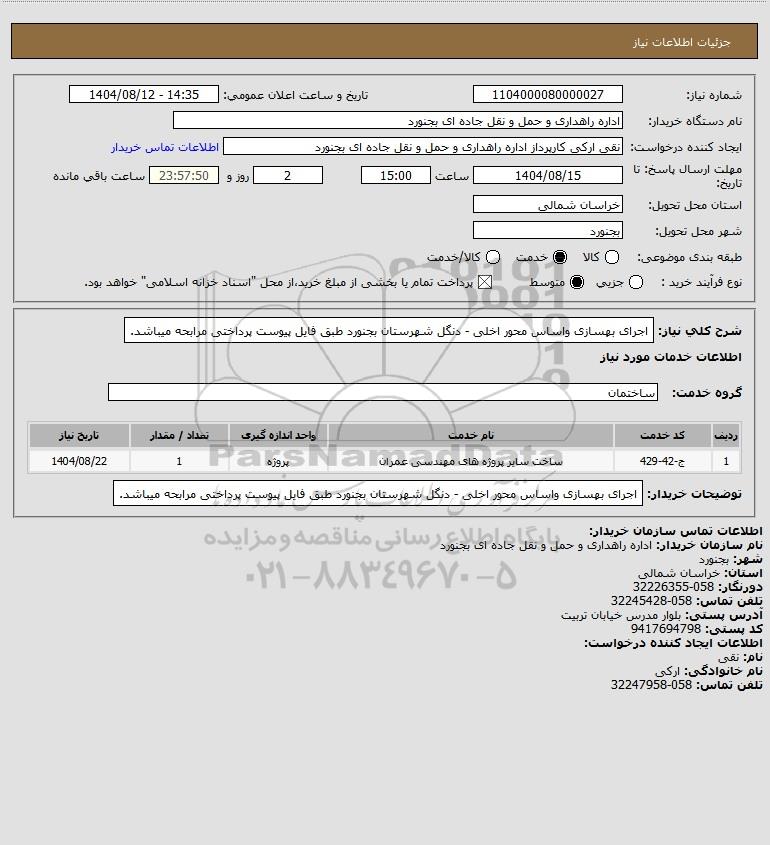 شرح کلی نیاز: اجرای بهسازی واساس محور اخلی - دنگل شهرستان بجنورد طبق فایل پیوست پرداختی مرابحه میباشد.
