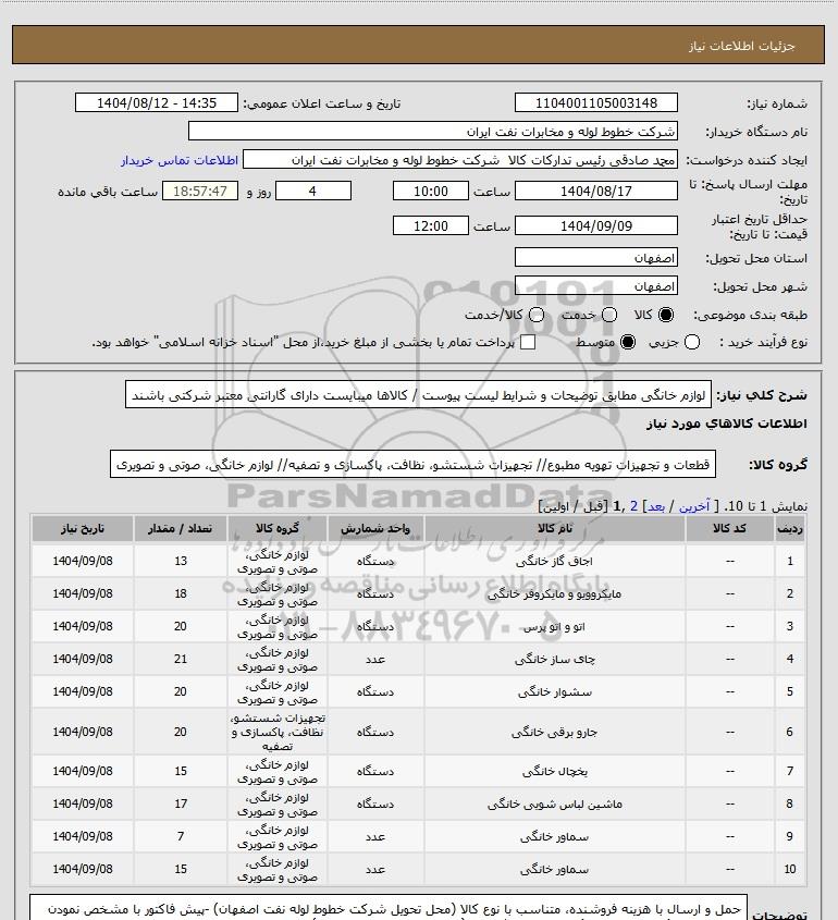 | 10 | -- | سماور خانگی | عدد | لوازم خانگی، صوتی و تصویری | 15 | 1404/09/08 |