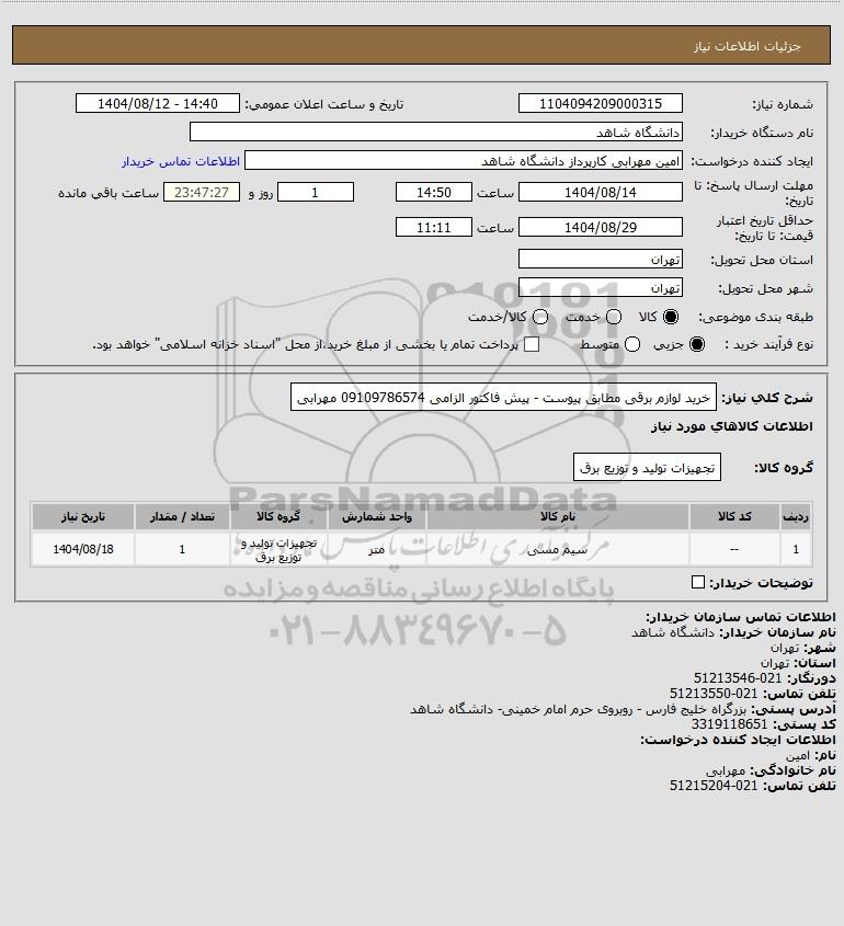 شرح کلی نیاز: خرید لوازم برقی مطابق پیوست - پیش فاکتور الزامی 09109786574 مهرابی