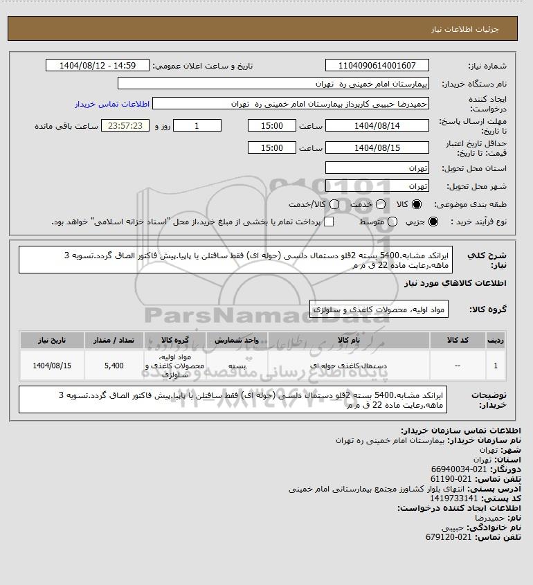 1 -- دستمال کاغذی حوله ای بسته مواد اولیه، محصولات کاغذی و سلولزی 5,400 1404/08/15