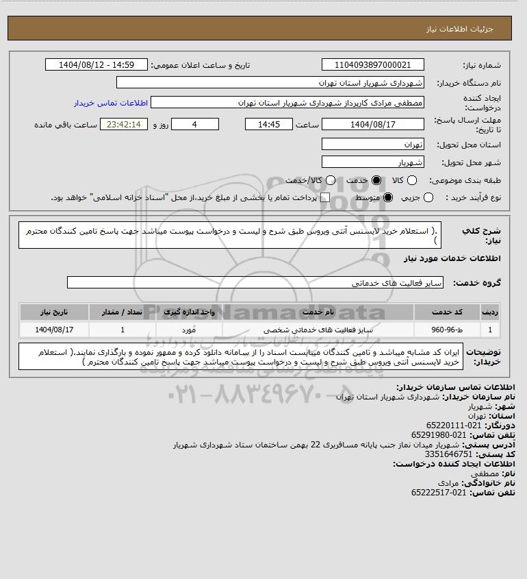 شرح کلی نیاز: .( استعلام خرید لایسنس آنتی ویروس طبق شرح و لیست و درخواست پیوست میباشد جهت پاسخ تامین کنندگان محترم )