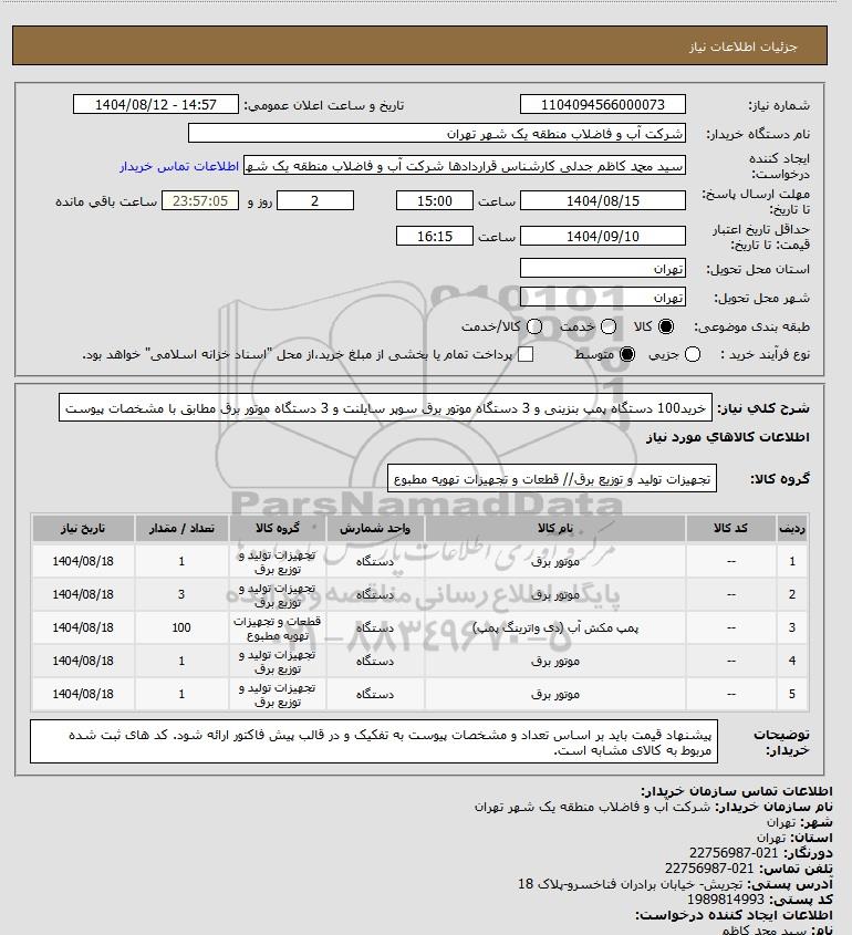 | 3 | -- | پمپ مکش آب (دی واترینگ پمپ) | دستگاه | قطعات و تجهیزات تهویه مطبوع | 100 | 1404/08/18 |