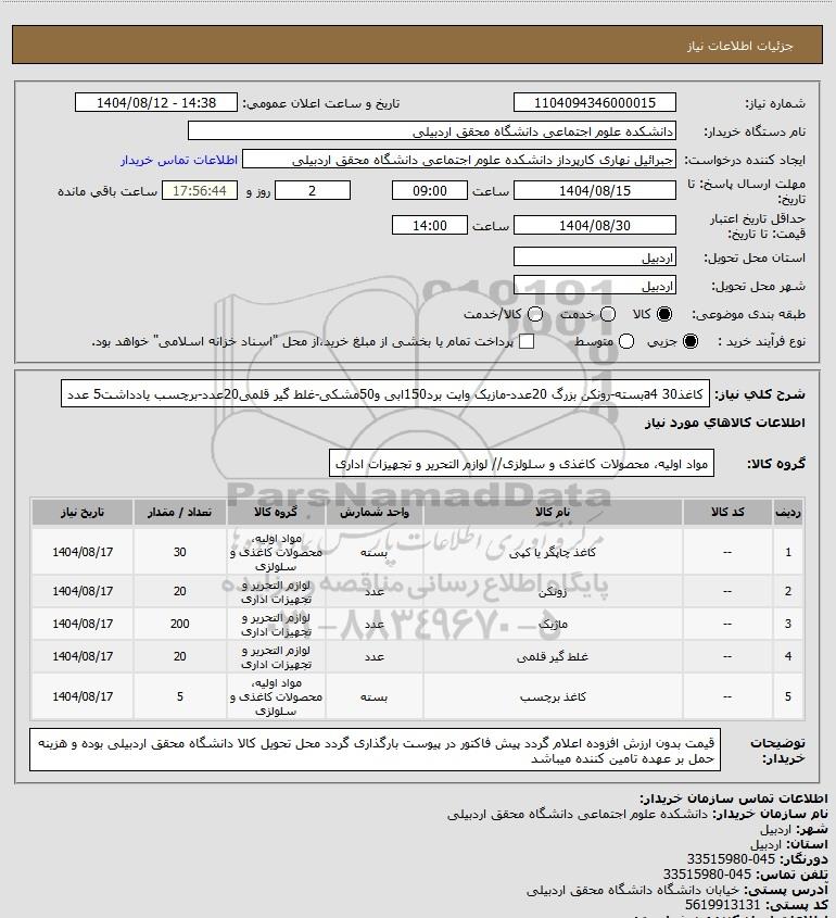 | 1 | -- | کاغذ چاپگر یا کپی | بسته | مواد اولیه، محصولات کاغذی و سلولزی | 30 | 1404/08/17 |