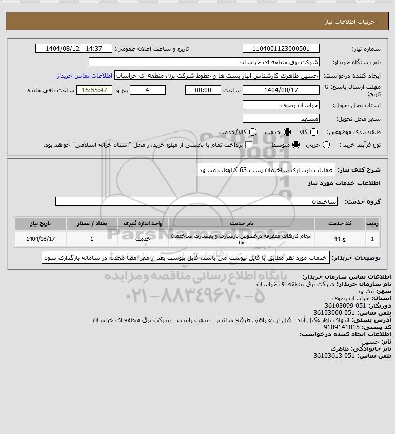 شرح کلی نیاز: عملیات بازسازی ساختمان پست 63 کیلوولت مشهد