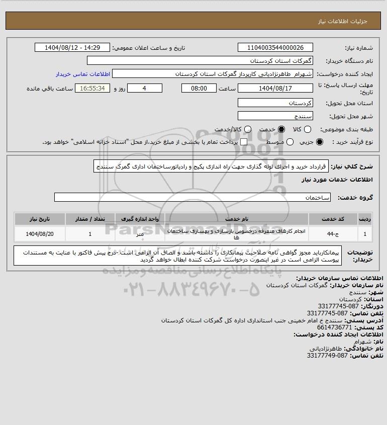 شرح کلی نیاز: قرارداد خرید و اجرای لوله گذاری جهت راه اندازی پکیج و رادیاتورساختمان اداری گمرک سنندج