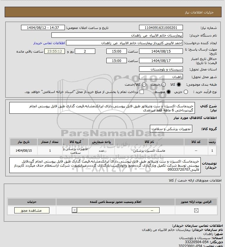 | 1 | -- | ماسک اکسیژن پزشکی | عدد | تجهیزات پزشکی و سلامت | 1 | 1404/08/15 |