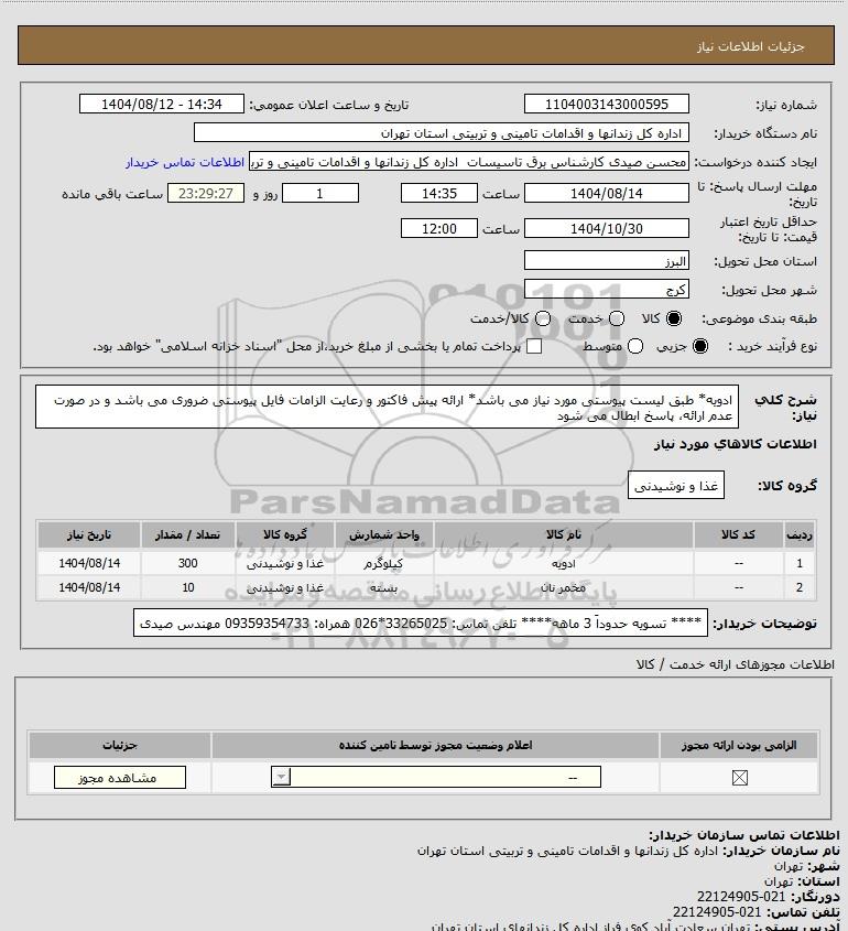 استعلام بها و موضوع استعلام استعلام ادویه* طبق لیست پیوستی مورد نیاز می باشد* ارائه پیش فاکتور و رعایت الزامات فایل پیوستی ضروری می باشد و در صورت عدم ارائه، پاسخ ابطال می شود به اطلاع کلیه شرکتها و افراد متخصص واجد شرایط میرساند، آگهی گذار در نظر دارد از طریق استعلام بها، نسبت به انتخاب و دریافت پیشنهادات اقدام نماید. این استعلام با کد آگهی ثبت شده در سامانه خبرگزاری پارس نماد : 9794983 منتشر شده است. مشخصات استعلام : تاریخ شروع استعلام: 1404/08/12 آخرین مهلت ارسال پیشنهاد قیمت : 1404/08/14 و محل اجرای پروژه : استان البرز میباشد. استعلام قیمت مورد درخواست : استعلام ادویه* طبق لیست پیوستی مورد نیاز می باشد* ارائه پیش فاکتور و رعایت الزامات فایل پیوستی ضروری می باشد و در صورت عدم ارائه، پاسخ ابطال می شود با دستهبندیهای تخصصی و گروه های مرتبط : مواد غذایی, استعلام اطلاع رسانی میگردد.