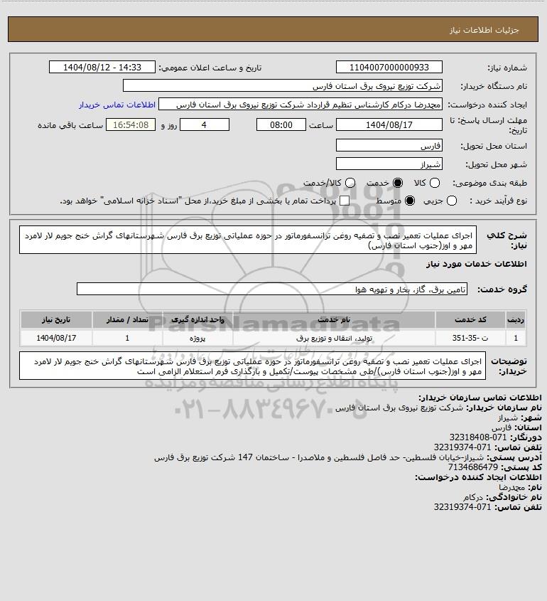 شرح کلی نیاز: اجرای عملیات تعمیر نصب و تصفیه روغن ترانسفورماتور در حوزه عملیاتی توزیع برق فارس شهرستانهای گراش خنج جویم لار لامرد مهر و اوز(جنوب استان فارس)