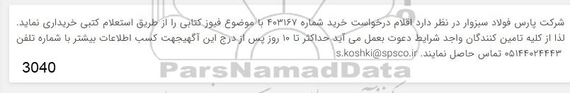 شرکت پارس فولاد سبزوار در نظر دارد اقلام درخواست خرید شماره 403167 با موضوع فیوز کتابی را از طریق استعلام کتبی خریداری نماید. لذا از کلیه تامین کنندگان واجد شرایط دعوت بعمل می آید حداکثر تا 10 روز پس از درج این آگهی جهت کسب اطلاعات بیشتر با شماره تلفن 05144024443 تماس حاصل نمایند.