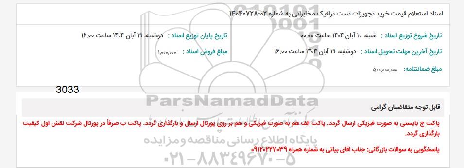 اسناد استعلام خرید تجهیزات تست ترافیک مخابراتی به شماره 02-14040728