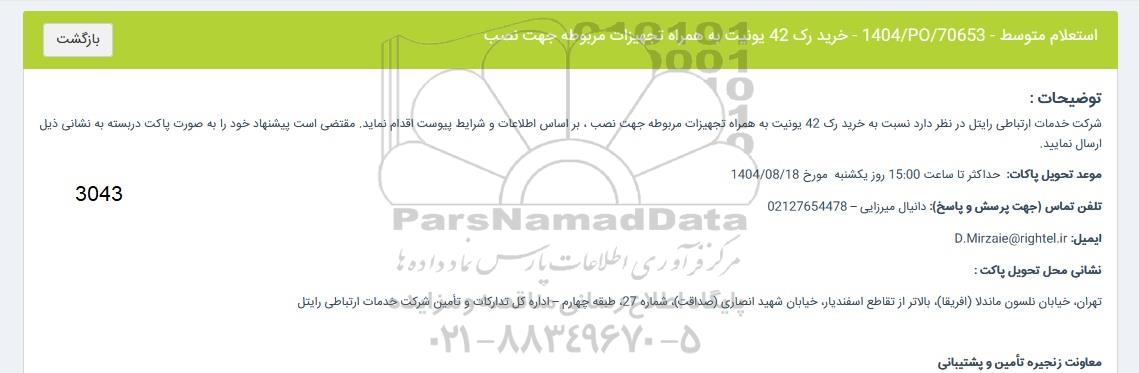 شرکت خدمات ارتباطی رایتل در نظر دارد نسبت به خرید رک 42 یونیت به همراه تجهیزات مربوطه جهت نصب ، بر اساس اطلاعات و شرایط پیوست اقدام نماید. مقتضی است پیشنهاد خود را به صورت پاکت در بسته به نشانی ذیل ارسال نمایید.