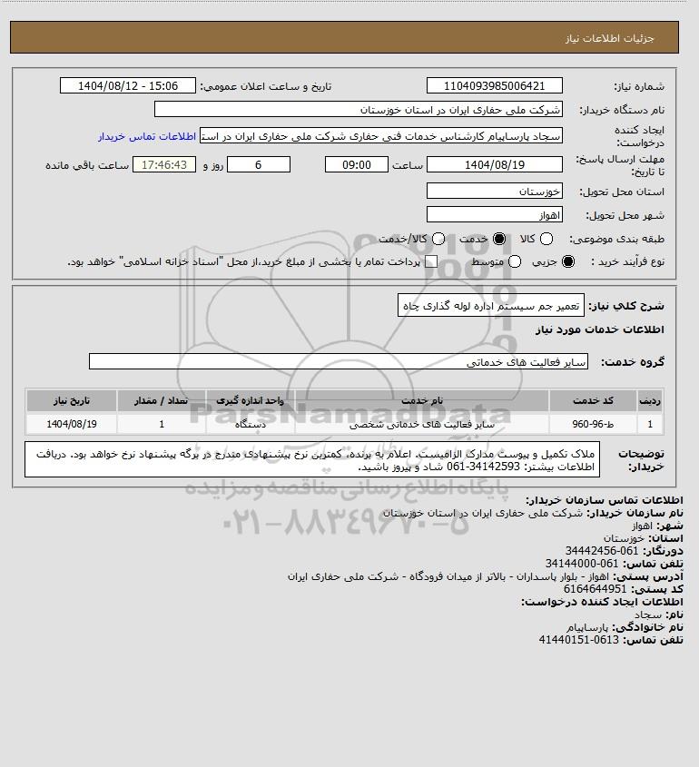 استعلام تعمیر جم سیستم اداره لوله گذاری چاه, استعلام تعمیر جم سیستم اداره لوله گذاری چاه
