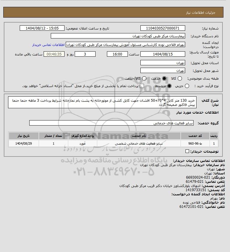 شرح کلی نیاز: خرید 130 متر کابل 4*70+50 افشان جهت کابل کشی از موتورخانه به پشت بام نمازخانه شرایط پرداخت 3 ماهه حتما حتما پیش فاکتور ضمیمه گردد