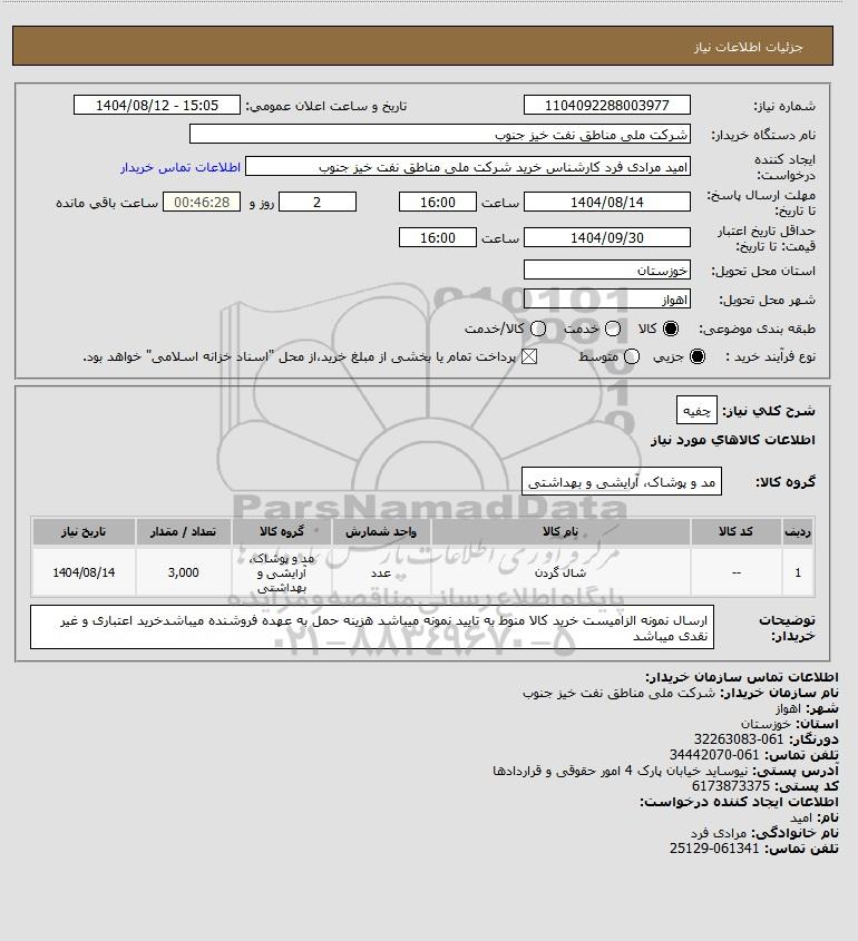| 1 | -- | شال گردن | عدد | مد و پوشاک، آرایشی و بهداشتی | 3,000 | 1404/08/14 |