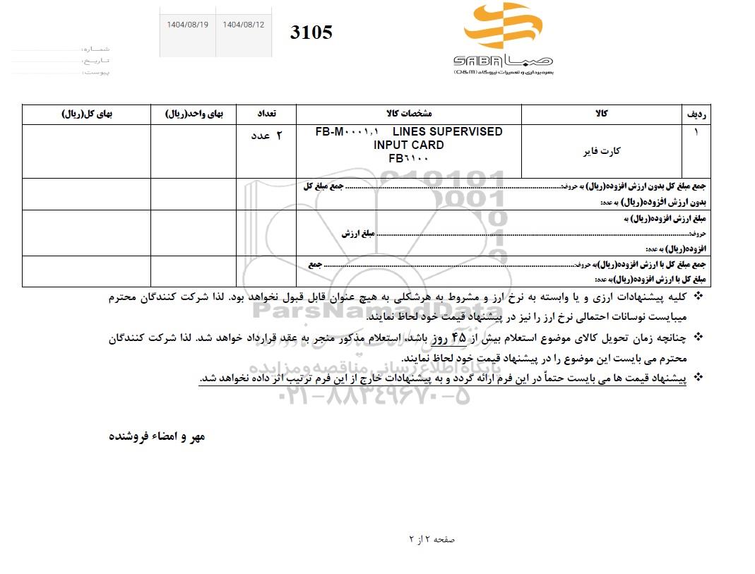 | 1 | کارت فایر | FB-M0001.1 LINES SUPERVISED INPUT CARD FB6100 | 2 عدد |
