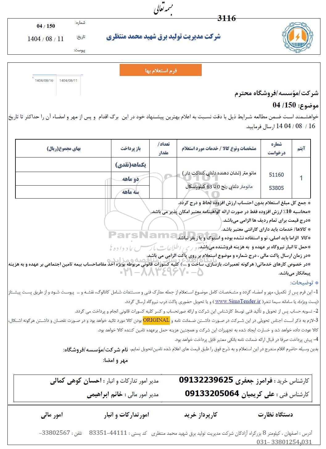 استعلام بها و موضوع استعلام استعلام مانو متر (نشان دهنده دلتابی کنتاکت دار) ... به اطلاع کلیه شرکتها و افراد متخصص واجد شرایط میرساند، آگهی گذار در نظر دارد از طریق استعلام بها، نسبت به انتخاب و دریافت پیشنهادات اقدام نماید. این استعلام با کد آگهی ثبت شده در سامانه خبرگزاری پارس نماد : 9795076 منتشر شده است. مشخصات استعلام : تاریخ شروع استعلام: 1404/08/12 آخرین مهلت ارسال پیشنهاد قیمت : 1404/08/16 و محل اجرای پروژه : استان اصفهان میباشد. استعلام قیمت مورد درخواست : استعلام مانو متر (نشان دهنده دلتابی کنتاکت دار) ... با دستهبندیهای تخصصی و گروه های مرتبط : ابزار دقیق, نیروگاه, تجهیزات برق و الکترونیک, استعلام اطلاع رسانی میگردد.