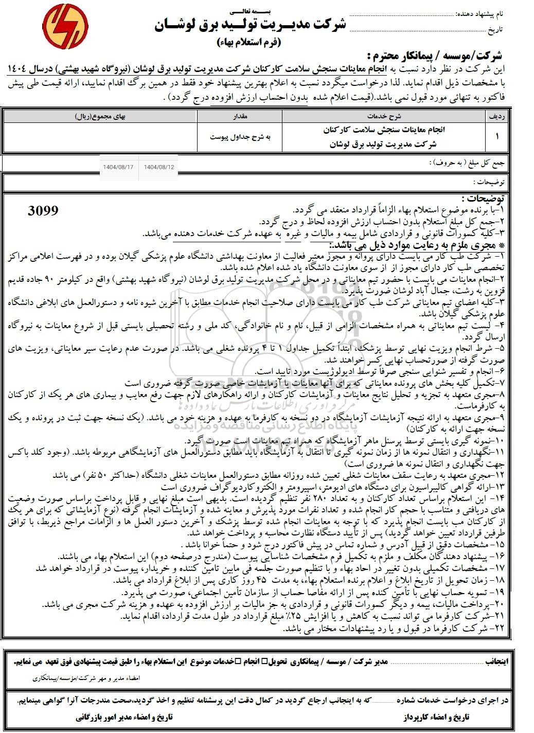 این شرکت در نظر دارد نسبت به انجام معاینات سنجش سلامت کارکنان شرکت مدیریت تولید برق لوشان نیروگاه شهید بهشتی در سال 1404 با مشخصات ذیل اقدام نماید. لذا درخواست میگردد نسبت به اعلام بهترین پیشنهاد خود فقط در همین برگ اقدام نمایید، ارائه قیمت طی پیش فاکتور به تنهایی مورد قبول نمی باشد. قیمت اعلام شده بدون احتساب ارزش افزوده درج گردد .