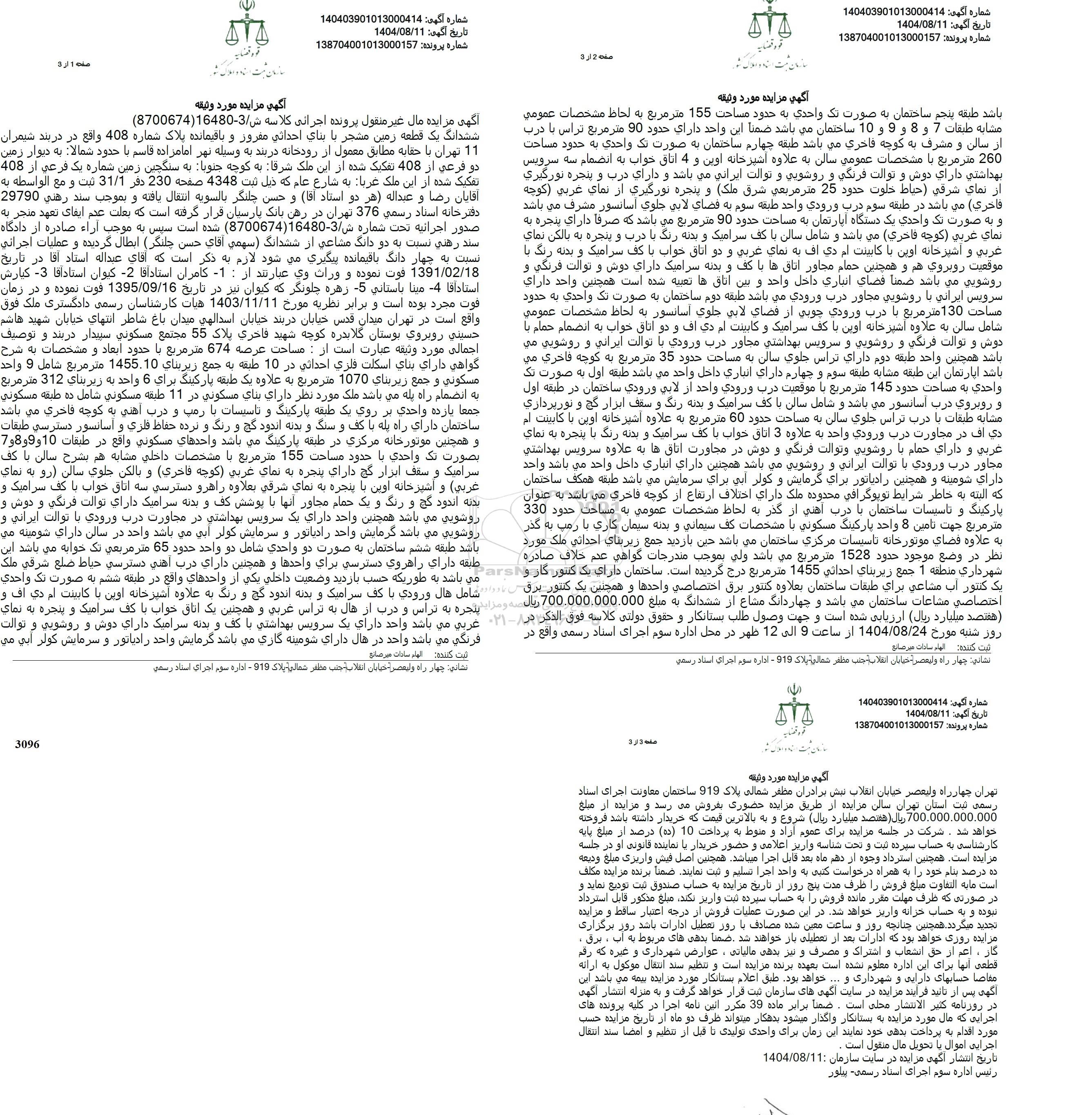 ششدانگ یک قطعه زمین مشجر با بنای احداثی مفروز و باقیمانده پلاک شماره 408 واقع در دربند شیمران 11 تهران با حقابه مطابق معمول از رودخانه دربند به وسیله نهر امامزاده قاسم با حدود شمالا به دیوار زمین دو فرعی از 408 تفکیک شده از این ملک شرقا به کوچه جنوبا به سنگچین زمین شماره یک فرعی از 408 تفکیک شده از این ملک غربا به شارع عام که ذیل ثبت 4348 صفحه 230 دفر 31.1 ثبت و مع الواسطه به آقایان رضا و عبداله هر دو استاد آقا و حسن چلنگر بالسویه انتقال یافته و بموجب سند رهني 29790 دفترخانه اسناد رسمي 376 تهران در رهن بانک پارسیان قرار گرفته است که بعلت عدم ایفای تعهد منجر به صدور اجرائيه تحت شماره ش 3-16480 (8700674) شده است سپس به موجب آراء صادره از دادگاه سند رهني نسبت به دو دانگ مشاعی از ششدانگ سهمي آقاي حسن (چلنگر ابطال گردیده و عملیات اجرائي نسبت به چهار دانگ باقیمانده پیگیری میشود لازم به ذکر است که آقای عبداله استاد آقا در تاریخ 1391.02.18 فوت نموده و وراث وي عبارتند از : -1 کامران استادآقا - کیوان استادآقا - کیارش استاداقا -4 مينا باستاني - زهره چلونگر که کیوان نیز در تاریخ 1395.09.16 فوت نموده و در زمان فوت مجرد بوده است و برابر نظریه مورخ 1403.11.11 هیات کارشناسان رسمی دادگستری ملک فوق واقع است در تهران میدان قدس خیابان در بند خیابان اسدالهی میدان باغ شاطر انتهای خیابان شهید هاشم حسيني روبروي بوستان گلابدره کوچه شهید فاخری پلاک 55 مجتمع مسكوني سپيدار دربند و توصیف اجمالی مورد وثیقه عبارت است از: مساحت عرصه 674 متر مربع با حدود ابعاد و مشخصات به شرحگواهي داراي بناي اسكلت فلزي احداثی در 10 طبقه به جمع زيربناي 1455.10 مترمربع شامل 9 واحد مسكوني و جمع زيربناي 1070 متر مربع به علاوه یک طبقه پارکینگ برای 6 واحد به زیر بناي 312 متر مربع به انضمام راه پله می باشد ملک مورد نظر داراي بناي مسكوني در 11 طبقه مسكوني شامل ده طبقه مسكوني جمعا یازده واحدی بر روی یک طبقه پارکینگ و تاسیسات با رمپ و درب آهنی به کوچه فاخري مي باشد ساختمان داراي راه پله با کف و سنگ و بدنه اندود گچ و رنگ و نرده حفاظ فلزی و آسانسور دسترسي طبقات و همچنین موتورخانه مرکزی در طبقه پارکینگ می باشد واحدهاي مسکوني واقع در طبقات 10 و 9و8و7 بصورت تک واحدی با حدود مساحت 155 متر مربع با مشخصات داخلي مشابه هم بشرح سالن با کف سرامیک و سقف ابزار گچ دارای پنجره به نماي غربي کوچه فاخري و بالكن جلوي سالن رو به نماي غربي و اشپزخانه اوپن با پنجره به نماي شرقي بعلاوه راهرو دسترسي سه اتاق خواب با کف سرامیک و بدنه اندود گچ و رنگ و یک حمام مجاور آنها با پوشش کف و بدنه سرامیک دارای توالت فرنگی و دوش و روشويي مي باشد همچنین واحد دارای یک سرویس بهداشتی در مجاورت درب ورودی با توالت ایرانی و روشویی می باشد گرمایش واحد رادیاتور و سرمایش کولر آبي مي باشد واحد در سالن داراي شومينه مي باشد طبقه ششم ساختمان به صورت دو واحدی شامل دو واحد حدود 65 متر مربعی تک خوابه می باشد این طبقه داراي راهروي دسترسي براي واحدها و همچنین دارای درب آهني دسترسي حياط ضلع شرقي ملک مي باشد به طوریکه حسب بازدید وضعيت داخلی يکی از واحدهای واقع در طبقه ششم به صورت تک واحدی شامل هال ورودی با کف سرامیک و بدنه اندود گچ و رنگ به علاوه آشپزخانه اوپن با کابینت ام دی اف و پنجره به تراس و درب از هال به تراس غربی و همچنین یک اتاق خواب با کف سرامیک و پنجره به نمای غربي مي باشد .واحد دارای یک سرویس بهداشتی با کف و بدنه سرامیک دارای دوش و روشویی و توالت فرنگی می باشد  و.....