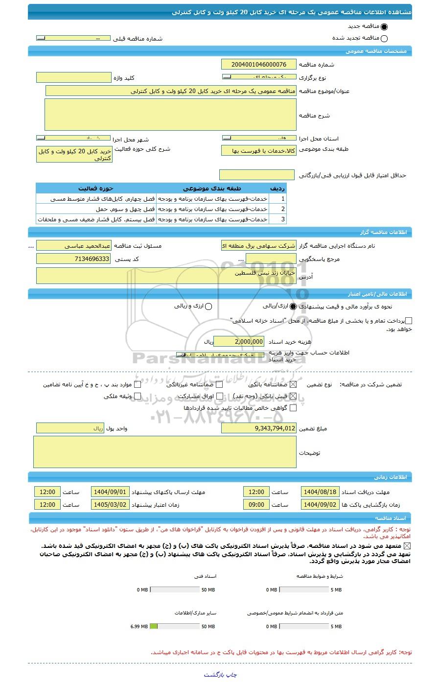 مناقصه مناقصه عمومی یک مرحله ای خرید کابل 20 کیلو ولت و کابل کنترلی از کلیه افراد متخصص و شرکتها واجد شرایط دعوت به عمل میآید در مناقصه با کد خبرگزاری پارس نماد: 9795364 شرکت نمایند.