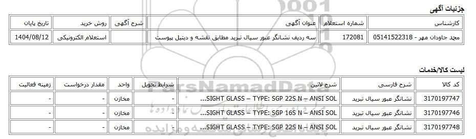| محمد جاودان مهر - 05141522318 | 172081 | سه ردیف نشانگر عبور سیال تبرید مطابق نقشه و دیتیل پیوست | استعلام الکترونیکی | 1404/08/12 |