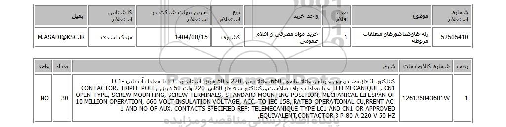 | 52505410 | رله هاوکنتاکتورهاو متعلقات مربوطه | 1 | خرید مواد مصرفی و اقلام عمومی | کشوری | 1404/08/15 | مزدک اسدی | M.ASADI@KSC.IR |