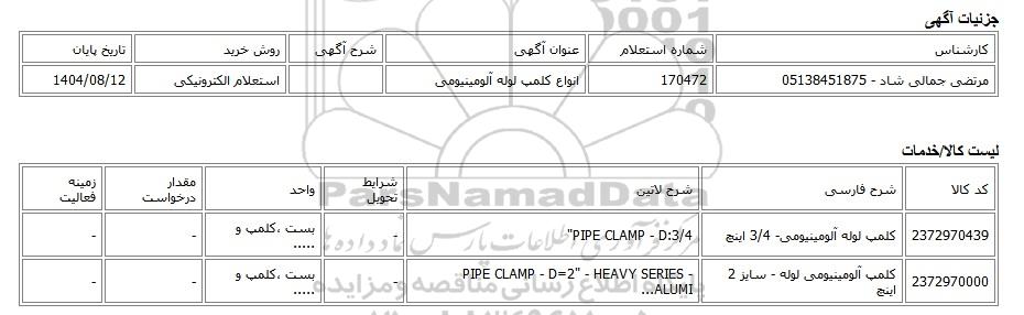 مرتضی جمالی شاد - 05138451875170472انواع کلمپ لوله آلومینیومیاستعلام الکترونیکی1404/08/12