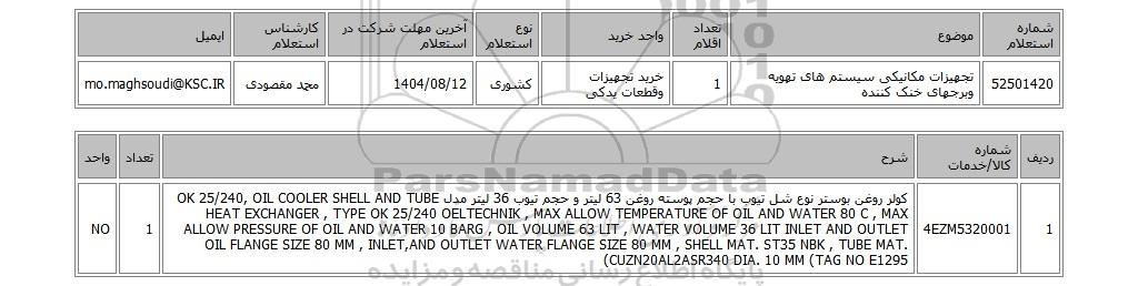 | 52501420 | تجهیزات مکانیکی سیستم های تهویه وبرجهای خنک کننده | 1 | خرید تجهیزات وقطعات یدکی | کشوری | 1404/08/12 | محمد مقصودی | mo.maghsoudi@KSC.IR |