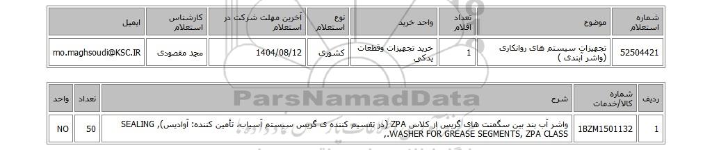 | 52504421 | تجهیزات سیستم های روانکاری (واشر آبندی ) | 1 | خرید تجهیزات وقطعات یدکی | کشوری | 1404/08/12 | محمد مقصودی | mo.maghsoudi@KSC.IR |