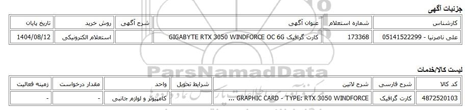 | علی ناصرنیا - 05141522299 | 173368 | کارت گرافیک GIGABYTE RTX 3050 WINDFORCE OC 6G | استعلام الکترونیکی | 1404/08/12 |