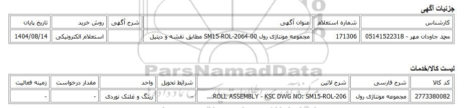 | محمد جاودان مهر - 05141522318 | 171306 | مجموعه مونتاژی رول SM15-ROL-2064-00 مطابق نقشه و دیتیل | استعلام الکترونیکی | 1404/08/14 |