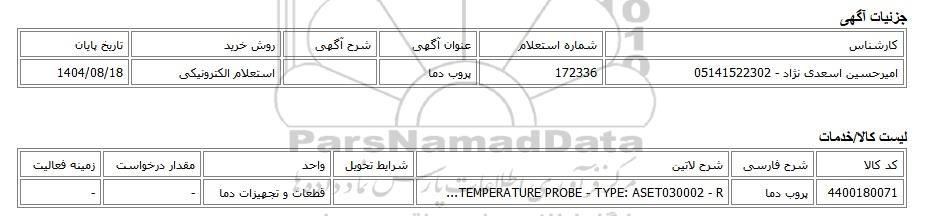 | امیرحسین اسعدی نژاد - 05141522302 | 172336 | پروب دما | استعلام الکترونیکی | 1404/08/18 |