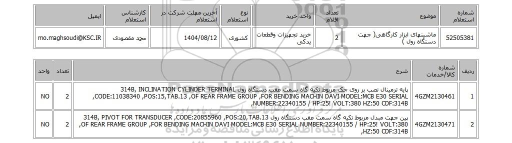 | 52505381 | ماشینهای ابزار کارگاهی( جهت دستگاه رول ) | 2 | خرید تجهیزات وقطعات یدکی | کشوری | 1404/08/12 | محمد مقصودی | mo.maghsoudi@KSC.IR |