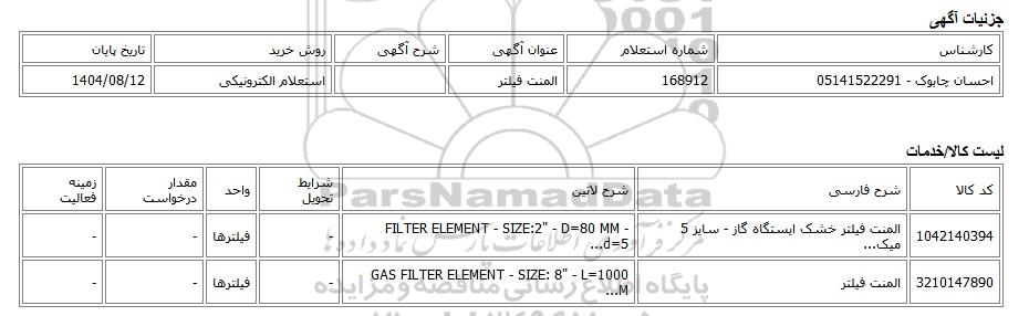 | احسان چابوک - 05141522291 | 168912 | المنت فیلتر | استعلام الکترونیکی | 1404/08/12 |