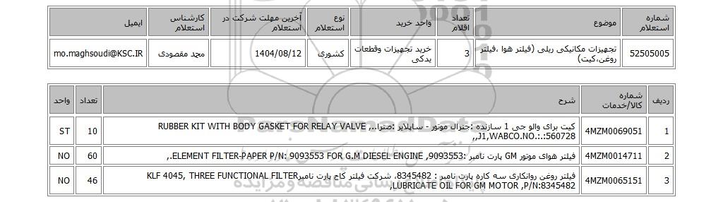 52505005تجهیزات مکانیکی ریلی (فیلتر هوا ،فیلتر روغن،کیت)3خرید تجهیزات وقطعات یدکیکشوری1404/08/12محمد مقصودیmo.maghsoudi@KSC.IR