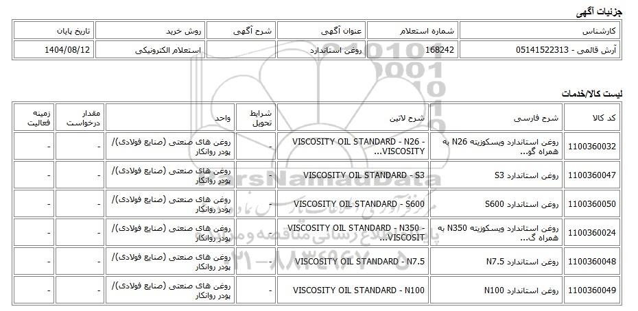 | آرش قائمی - 05141522313 | 168242 | روغن استاندارد | استعلام الکترونیکی | 1404/08/12 |