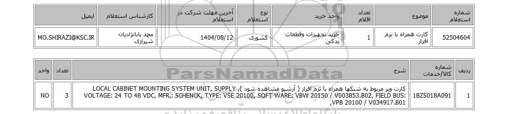 | 52504604 | کارت همراه با نرم افزار | 1 | خرید تجهیزات وقطعات یدکی | کشوری | 1404/08/12 | محمد بابانژادیان شیرازی | MO.SHIRAZI@KSC.IR |