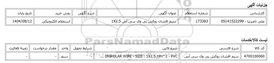 علی ناصرنیا - 05141522299173363سیم افشان روکش پی وی سی آبی 1X2.5استعلام الکترونیکی1404/08/12