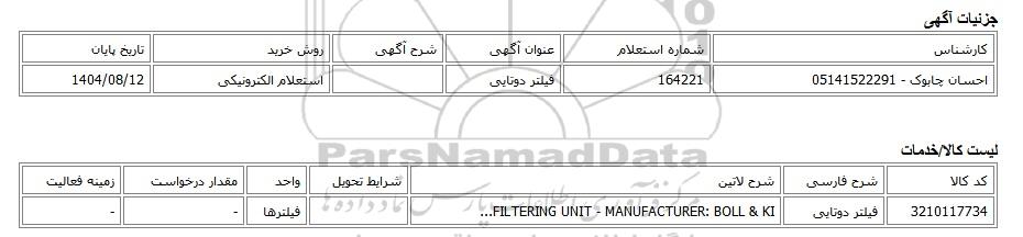 3210117734فیلتر دوتاییFILTERING UNIT - MANUFACTURER: BOLL & KI... فیلترها--