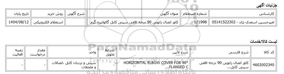 استعلام الکترونیکی کاور اتصال زانویی 90 درجه افقی سینی کابل گالوانیزه گرم, استعلام الکترونیکی، کاور اتصال زانویی 90 درجه افقی سینی کابل گالوانیزه گرم