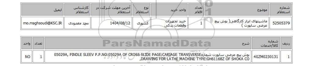 | 52505379 | ماشینهای ابزار کارگاهی( بوش پیچ عرضی ساپورت ) | 1 | خرید تجهیزات وقطعات یدکی | کشوری | 1404/08/12 | محمد مقصودی | mo.maghsoudi@KSC.IR |