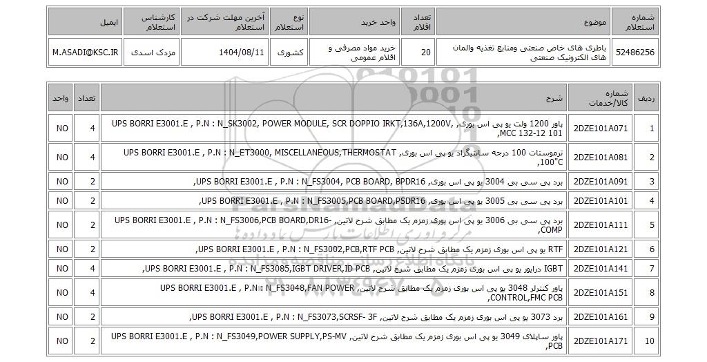 | 52486256 | باطری های خاص صنعتی ومنابع تغذیه والمان های الکترونیک صنعتی | 20 | خرید مواد مصرفی و اقلام عمومی | کشوری | 1404/08/11 | مزدک اسدی | M.ASADI@KSC.IR |