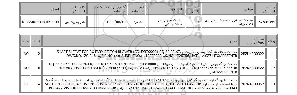 52504984ساخت اضطراری قطعات کمپرسور GQ22-233ساخت تجهیزات و قطعات یدکیکشوری1404/08/10نادر بصیری پورN.BASIRIPOUR@KSC.IR