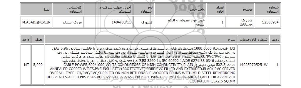 52503904کابل ها ورساناها1خرید مواد مصرفی و اقلام عمومیکشوری1404/08/11مزدک اسدیM.ASADI@KSC.IR